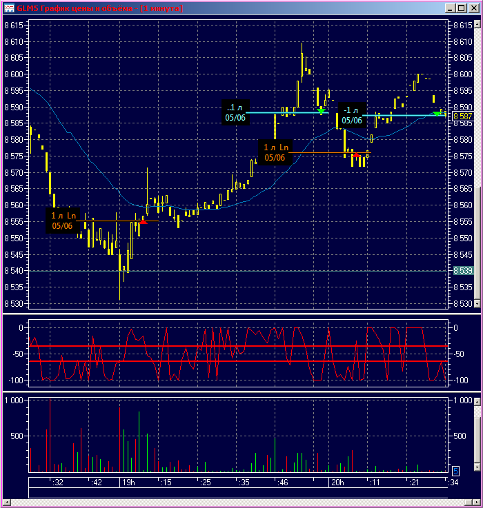 Также в полуавтоматическом режиме поддерживается быстрое выставление заявок через стандартный стакан QUIK и корректировка мышью положения заявок непосредственно на графике цены в визуальном режиме.