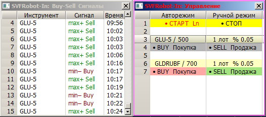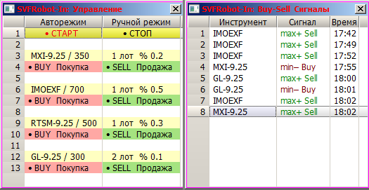 После запуска скрипта робота SVFRobot-In.lua появляется панель управления в виде небольшой таблицы, в которой отображаются до четырёх контрактов одновременно, причём в автоматическом режиме поддерживается торговля по одному контракту и одновременно по трём контрактам возможна работа в ручном полуавтоматическом режиме. Также возможен одновременный запуск нескольких копий скрипта (из разных рабочих папок) для торговли в автоматическом режиме по нескольким фьючерсным контрактам с помощью нескольких панелей управления.
