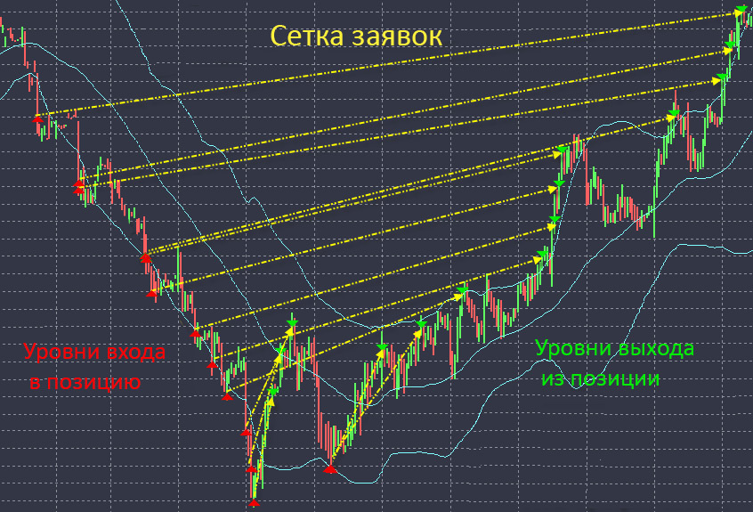 Доходность такой стратегии сетки–лесенки при работе в полосе–канале с использованием робота может уверенно составлять 25%–35% годовых и более.
